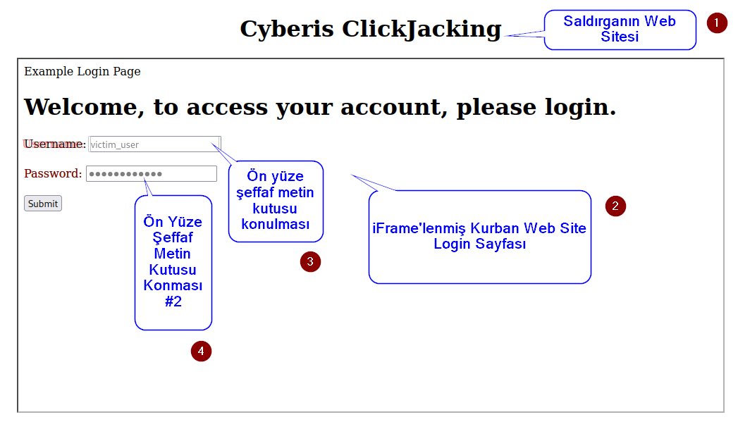 Açıklık Önem Derecesi: Düşük Açıklığın Etkisi: Bilgi İfşası Açıklığın Açıklaması: Kurum (meşru) web sitesinin login sayfası koruma bulunmamaktaysa iframe ile saldırgan web sitelerine yerleştirilebilir. Saldırgana ait web sitede iframe ile sergilenen meşru web sitenin login sayfası üzerine saldırgan yarı opak / şeffaf kullanıcı adı, parola <input metin kutuları ve buton yerleştirebilir. Örn;
