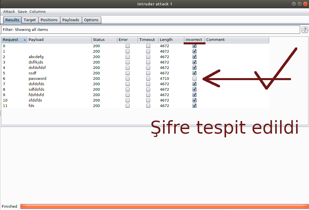 doğru giriş teşebbüsünde ise hata kelimeleri sütunu tick almaz. Kullanıcı Adı Şifre yanlis sifre girdiniz admin aaaa (tick) admin aaab (tick) ... ... (tick) ... ... (tick) admin toka (empty) // Şifre Tespit Edildi ... ... (tick) admin zzzz (tick) Giriş yapılırken doğru deneme sonucu gelen hoşgeldiniz vari cümle referans alındığında;