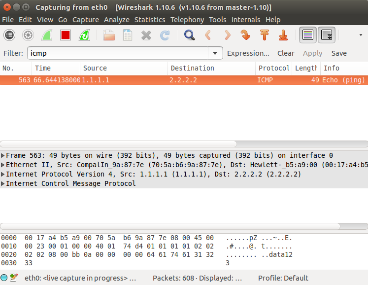 Görüldüğü üzere oluşturduğumuz icmp paketi wireshark ekranına düşmüştür. Ekranın altında yer alan paketin raw halinde data123 payload'umuzu da görebiliriz.