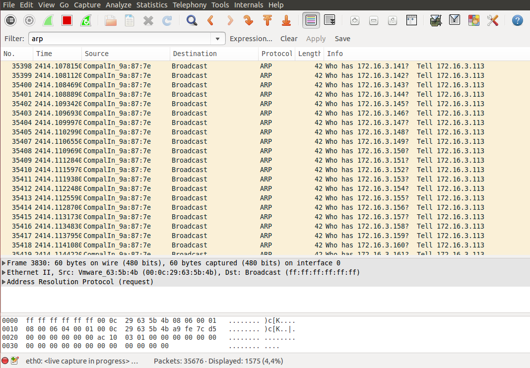Kayıtların Info sütunundan görülebileceği üzere sırayla tüm IP'lerin mac adresleri sorulmaktadır ve 172.16.3.113'e (yani bize) cevabı döndür denmektedir.