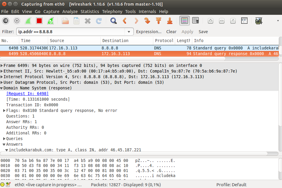 Filter : ip.addr == 8.8.8.8