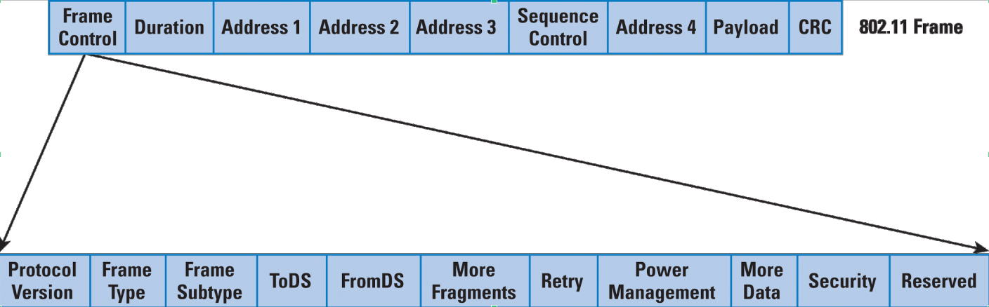 BackgroundKablosuz ağlarda haberleşme işlemi frame'ler (çerçeveler) üzerinden gerçekleşir. 802.11 standartlarına uygun bir frame'in iç yapısı aşağıdaki gibidir.