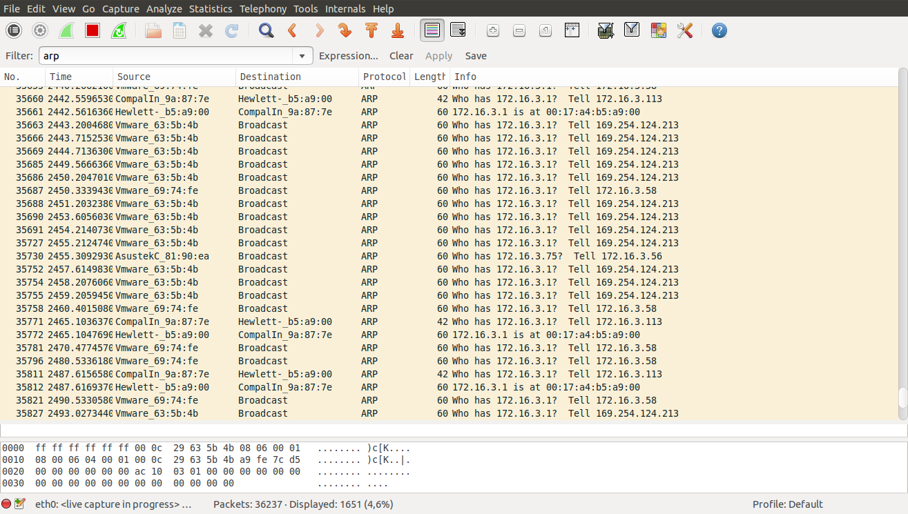 Kayıtların Info sütunundan görülebileceği üzere sırayla tüm IP'lerin mac adresleri sorulmaktadır ve 172.16.3.113'e (yani bize) cevabı döndür denmektedir.