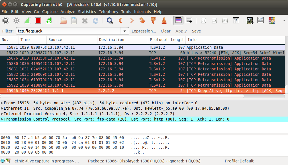 Turuncu renkle gösterilen kayıttan görebileceği üzere oluşturduğumuz ACK paketi ekrana düşmüştür.