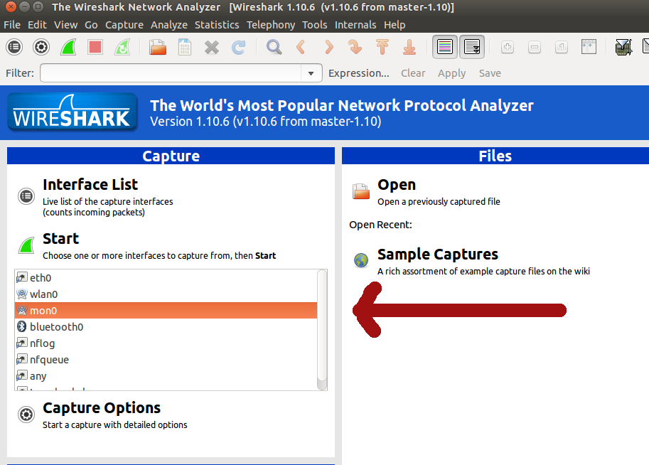 wlan2 interface'inin Driver sütunundan da görülebileceği üzere wlan2 monitör moda geçirilmiştir. Fakat dikkat ederseniz monitör modun mon0 adlı interface üzerinden enable edildiği söylenmektedir. Dolayısıyla wireshark'ta dinleyeceğimiz interface mon0 olacaktır. Şimdi wireshark'ı başlatalım. sudo wireshark Ardından sıralı interface'lerden mon0'yu seçelim ve start düğmesine tıklayalım.