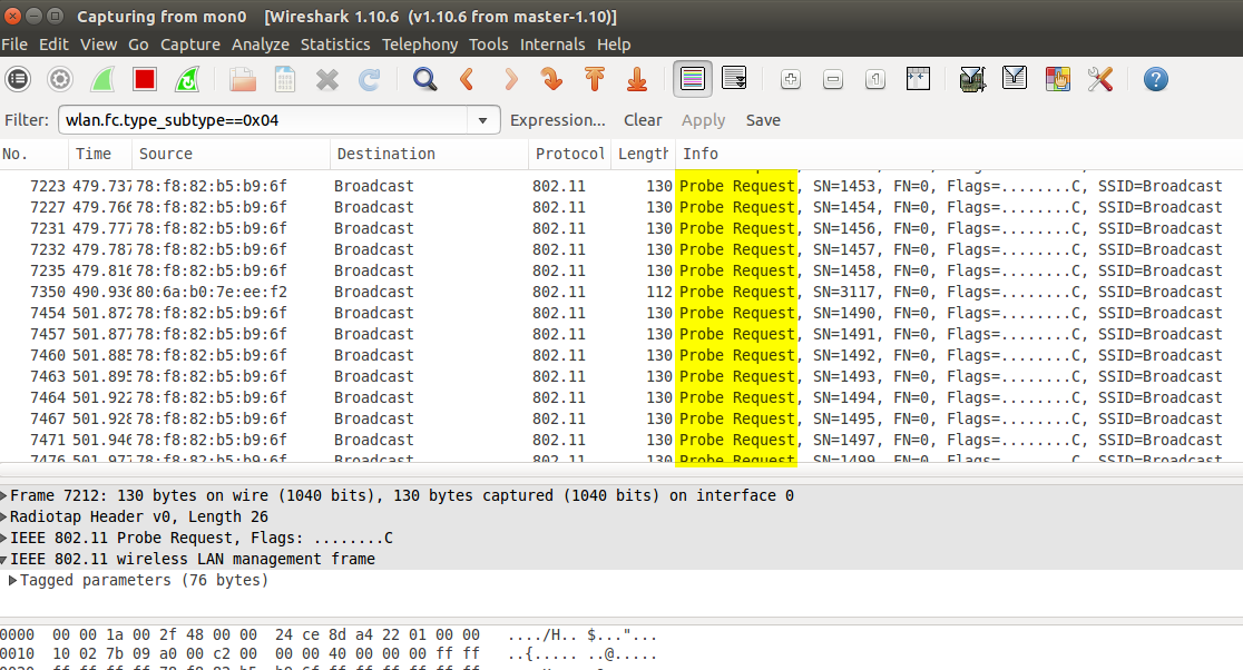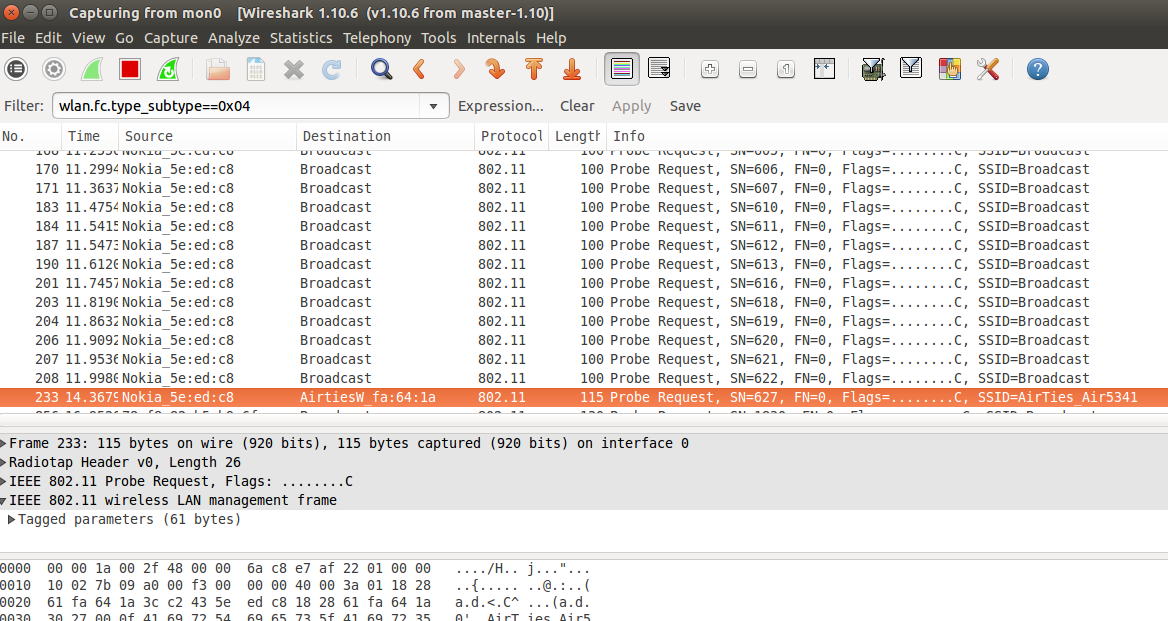 Ardından açılan penceredeki filtre kutusuna aşağıdaki kodu girelim: wlan.fc.type_subtype==0x04 4 numarası Probe Request frame'lerinin numarasını temsil eder. Yukarıdaki kod filtreye konulduğu takdirde etrafta yakalanan tüm probe request frame'lerini görüntülüyor olacağız.